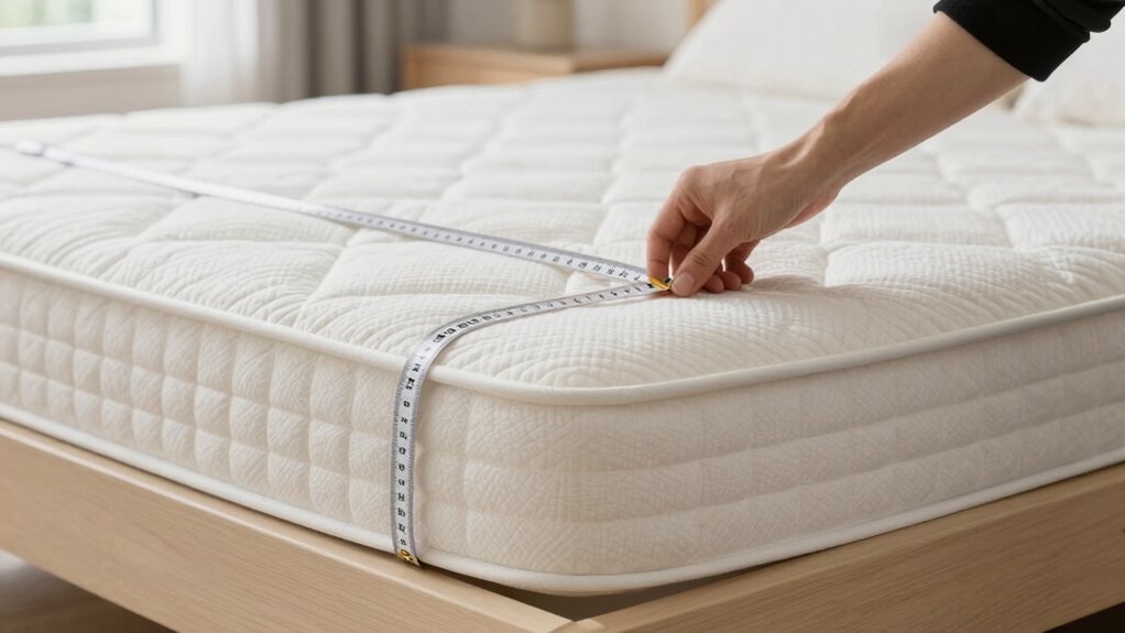 You can measure your mattress without removing bedding by using a flexible tape measure or a ruler. Keep in mind, bedding might add a little to the bed height, so measure from the top of the mattress to the floor. Be gentle around the edges to avoid disturbing the mattress’s shape. Knowing the bed height and mattress weight helps guarantee your measurements are accurate without needing to strip the bed.