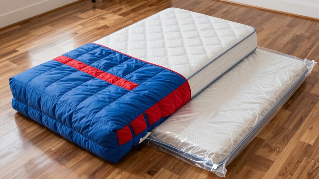 When it comes to protecting your mattress during a move, longevity is crucial. The longevity comparison among wraps, bags, and blankets depends on material strength and how well they withstand wear and tear. Typically,: