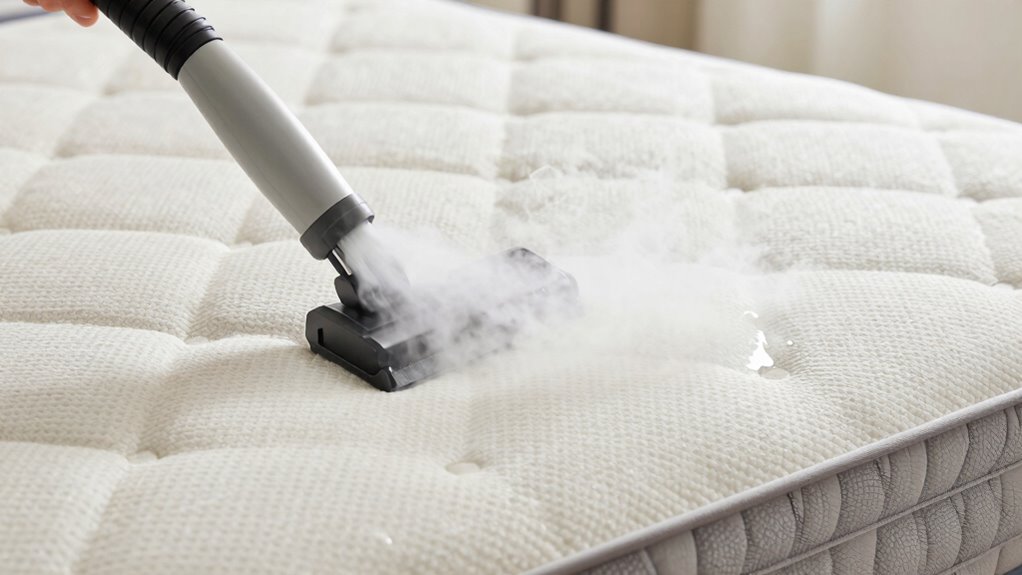 Vacuuming your mattress thoroughly is the next step to prepare it for steaming. Regular vacuuming is essential for proper mattress maintenance and helps remove dust, allergens, and skin flakes that accumulate over time. Before steaming, guarantee you cover the entire surface, including seams and edges, to maximize cleanliness. This step aligns with your cleaning schedule, keeping your mattress fresh and hygienic. Use a vacuum with a high-efficiency particulate air (HEPA) filter to trap even tiny particles. Taking this precaution minimizes debris that could trap moisture or interfere with the steaming process. Proper vacuuming not only enhances your mattress’s overall cleanliness but also reduces potential moisture issues, making steaming safer and more effective. Incorporating free floating techniques during vacuuming can help dislodge dust particles from hard-to-reach areas, ensuring a more thorough clean.