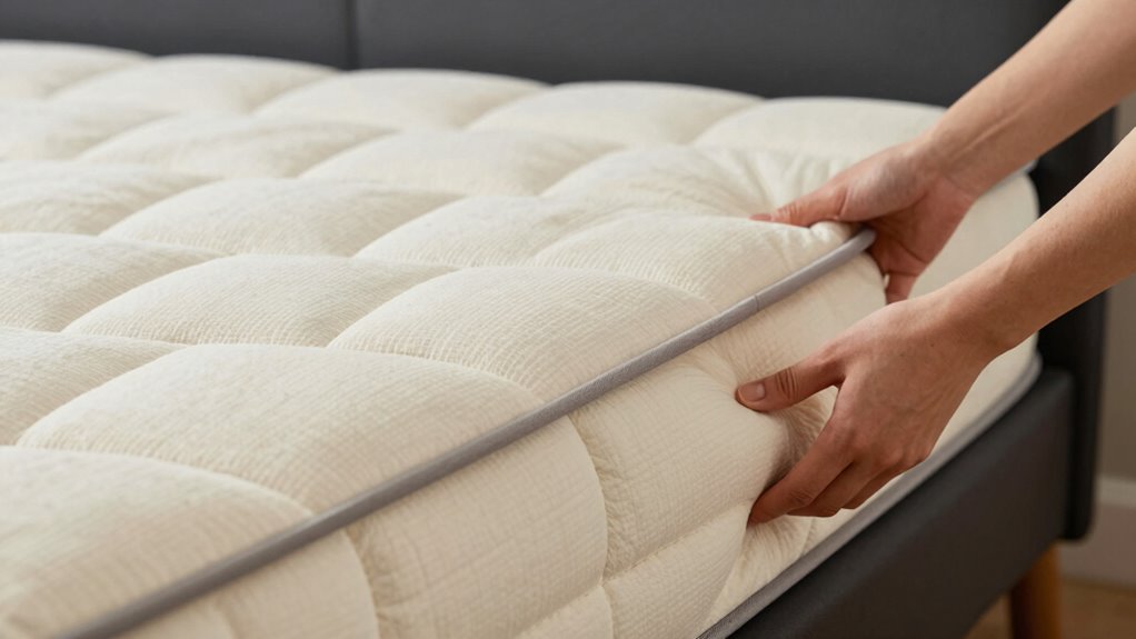 Don’t put all your eggs in one basket—test the mattress’s supportiveness by checking the bed frame stability and mattress edge support. Press firmly along the edges and center to see if the mattress compresses evenly or sags. Observe how well the mattress maintains its shape without feeling soft or uneven. A firm, stable surface indicates good support, so you won’t be surprised when you finally lie down.