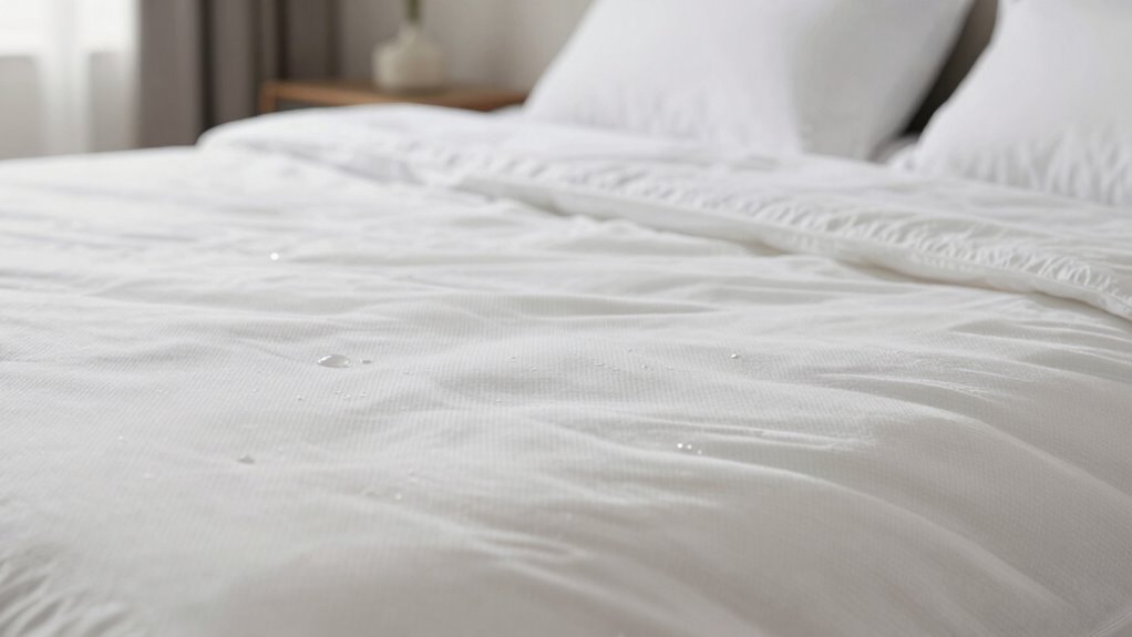 Once your mattress cover is clean, proper drying is essential to prevent mold, mildew, and damage. Air drying in a well-ventilated area is best, but using a dryer on a low heat setting works too. Avoid fabric softeners during the wash, as they can decrease fabric breathability. For stain removal, treat stains promptly with gentle solutions before drying. To keep your cover fresh and soft, consider tumble drying with dryer balls, which help fluff the fabric naturally. Ensuring proper color accuracy during washing can help preserve the fabric’s appearance and longevity.