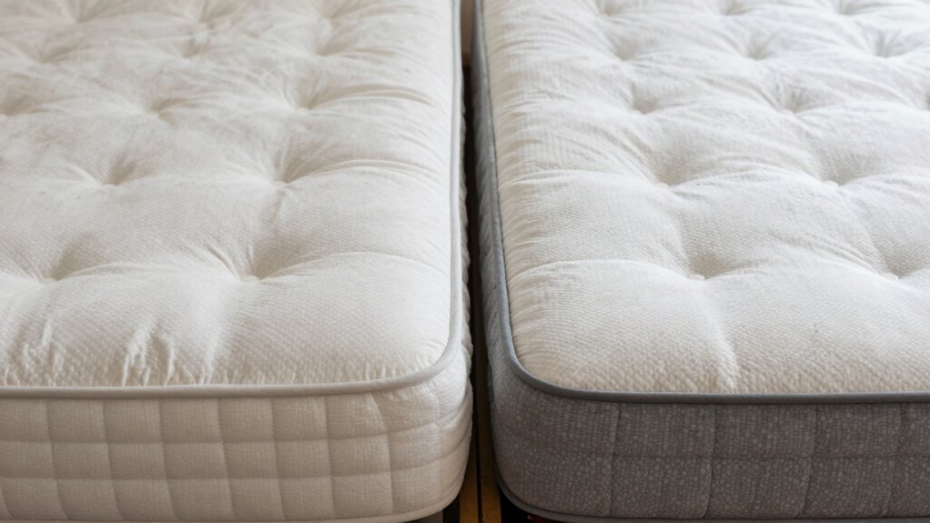 Your sleeping posture also interacts with your body weight to influence how well your mattress performs. If you sleep on your side, your weight concentrates on your shoulders and hips, so a mattress that provides adequate cushioning in those areas is essential. For back sleepers, maintaining proper spinal alignment relies heavily on a mattress that supports the natural curves of your body, especially if you’re heavier, since too firm a mattress can push on your pressure points, causing discomfort. Stomach sleepers often need firmer surfaces to prevent their hips from sinking too deeply, which can lead to misalignment and back pain. Your weight impacts how these postures feel on different mattresses, dictating whether you need more support or more softness.