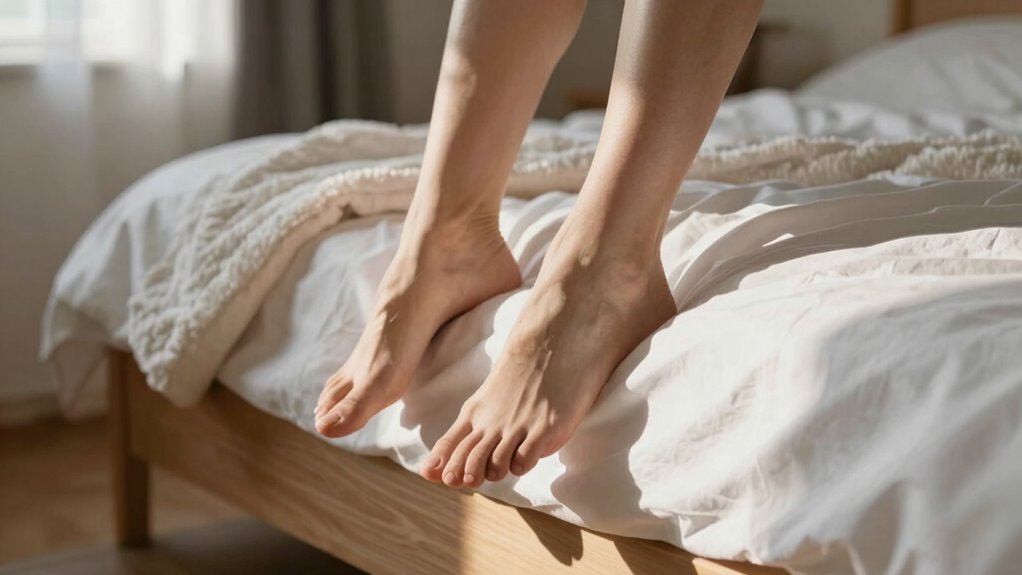 Placing your feet off the bed can directly reduce muscle tension by improving circulation and calming your nervous system. When you hang your feet, blood flows more freely, promoting muscle relaxation and easing tension in your legs and lower back. This position helps your nervous system relax, reducing stress-related tightness. Imagine: