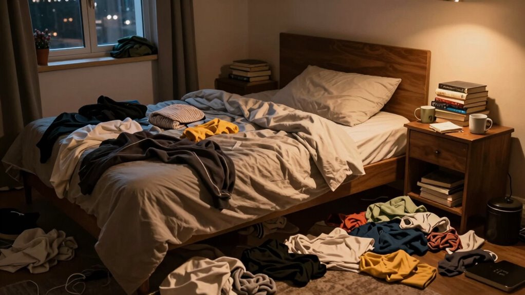 Unfinished tasks in your bedroom can keep your mind alert long after you’ve turned out the lights. Visual clutter like incomplete projects or scattered belongings act as constant reminders that you haven’t achieved task completion, making it hard to relax. Your brain perceives these unfinished projects as unresolved issues, triggering stress and preventing restful sleep. Additionally, clutter can interfere with your ability to manage home energy efficiently, creating a sense of chaos that extends beyond just mental distraction.