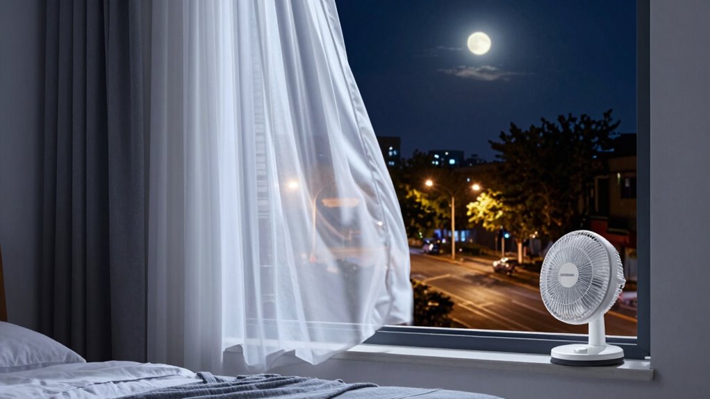 Strategically placing windows across different walls creates cross-ventilation, which considerably improves airflow during the night. Your room orientation plays a key role—position windows where prevailing breezes flow naturally. Proper window placement maximizes airflow and ensures fresh air enters efficiently. Consider these options: