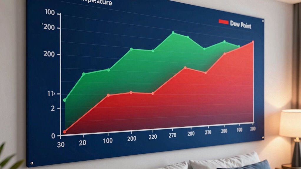 If your dew point is too high, you might notice sleep discomfort, like waking up feeling sweaty or stuffy. You could also see signs of mold growth on walls, ceilings, or bedding. Conversely, if the dew point is too low, you may experience dry skin, sore throat, or nasal congestion. Maintaining proper dew point levels helps guarantee a comfortable sleep environment and prevents mold issues caused by excess moisture.