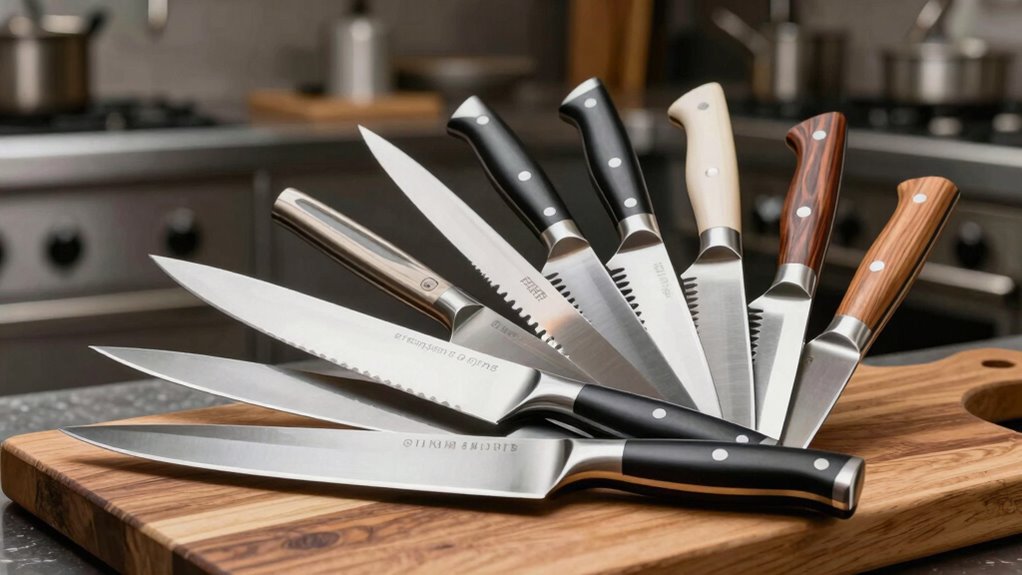A sharp, durable blade is fundamental for efficient food prep, and how well a knife retains its edge depends on several key factors. High-quality steel combined with proper heat treatment is vital, as it guarantees the blade stays sharp longer over time. The design features, like a taper-ground edge or full bolster, also influence edge retention during use. Regular honing and proper sharpening techniques are essential to maintain the blade’s edge and prevent dullness. Knives made from high-carbon stainless steel generally hold their sharpness better than those from softer materials. Additionally, the sharpening angle, typically between 13° and 20°, affects how long the edge remains sharp with proper maintenance. Choosing a knife with these factors in mind helps guarantee lasting performance in your kitchen.