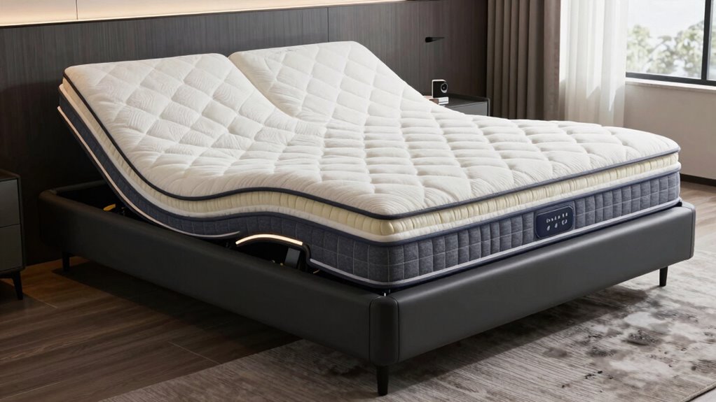 Choosing an adjustable base that works well with your latex mattress requires careful attention to compatibility factors. First, verify the base can support the weight and flexibility of latex, which can be heavier and more responsive than other materials. Check that the frame can accommodate your mattress thickness, usually between 8 to 12 inches, to prevent gaps or instability. It’s also vital that the base’s mechanisms don’t damage or compress the latex, preserving its elasticity and comfort. Confirm that adjustable features like head and foot inclines don’t create uneven pressure points that could harm the mattress. Finally, opt for a base with a firm, level surface to prevent sagging and misalignment, which can reduce your mattress’s support and lifespan.