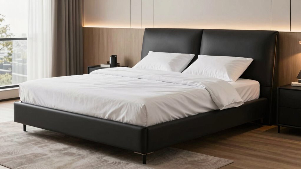 Think of safety features as the sturdy anchor in a sea of comfort. Crucial ones include anti-slip legs to keep the bed steady, motion sensors that pause adjustments if movement is detected, and emergency release cords for quick disassembly. Child safety locks and overheat protection are also essential, ensuring peaceful sleep without worries. These features act as guardians, allowing you to relax fully in your king-sized oasis.