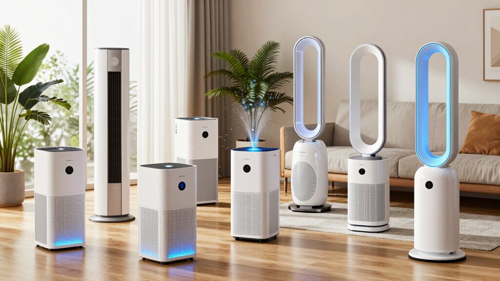 If you’re looking for the best air purifiers for dust allergies in 2026, I’ve found top models that combine powerful HEPA filters, large room coverage, and smart features for custom control. These units, certified by organizations like AHAM and CARB, effectively trap dust, pollen, pet dander, and VOCs. Many also offer quiet modes and app connectivity, making them perfect for home use. Keep listening to learn how to pick the right one for your space.