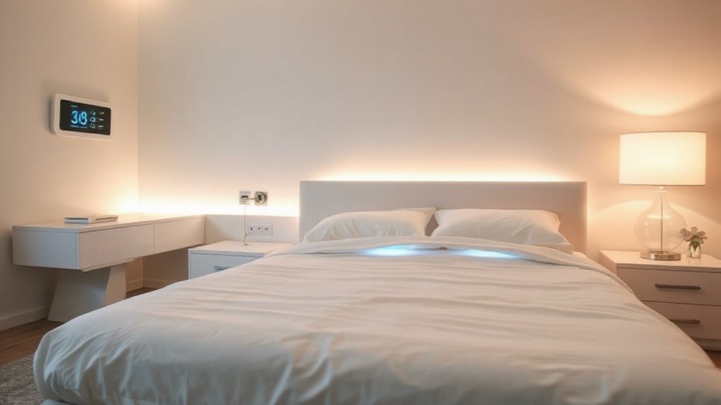 Since noise can substantially impact sleep quality, paying attention to the sound levels of a bed cooling system is vital. Ideally, a quieter system around 50dB or less helps prevent sleep disturbances caused by loud operational sounds. Different models generate varying noise from water pumps, fans, or compressors, so choosing ones with low-noise technology is essential. Ultrasonic or silent pumps produce minimal sound, often just a gentle hum, making them perfect for sensitive sleepers. The decibel rating directly reflects how loud a device is; lower ratings mean quieter operation. Continuous or sudden noises can disrupt sleep cycles, so I recommend reviewing user feedback or testing devices beforehand. Prioritizing quiet systems ensures restful, uninterrupted sleep throughout the night.