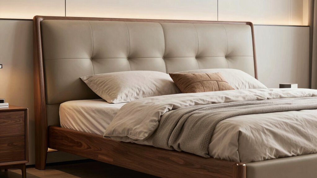 The design of your bed frame, including the headboard and footboard, plays a crucial role in shaping your bedroom’s overall look. Choosing a style that complements your decor and theme is indispensable. For example, a vintage bed adds charm, while modern designs offer clean lines and sleek appeal. Material and upholstery, like velvet or metal, also influence the room’s aesthetic and tactile experience. The shape and detailing, such as tufted, curved, or nailhead trim, serve as focal points that elevate the visual interest. Coordinating the bed frame’s color and finish with other furnishings helps create a harmonious space. Ultimately, selecting a design that aligns with your desired ambiance ensures your bedroom feels cohesive, inviting, and uniquely yours.