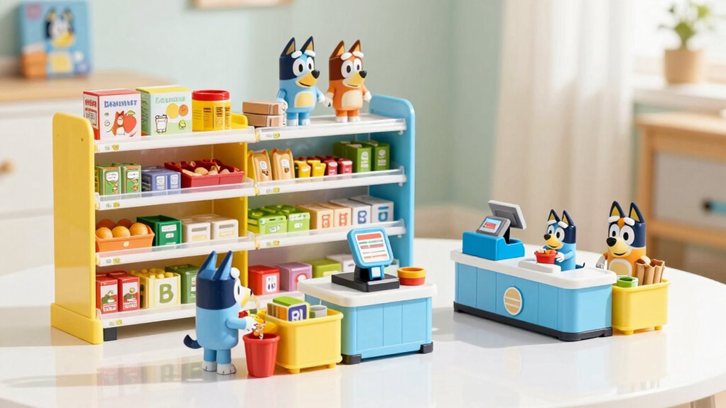 A wide variety of accessories can make a Bluey supermarket playset more engaging and fun for kids. When choosing a set, I look for high-quality accessories made from durable, safe materials that can withstand active play. Small, detailed pieces are a bonus because they help improve fine motor skills and encourage precise manipulation. It’s important that the accessories match the theme of the playset, creating a cohesive and immersive experience. Realistic textures and vibrant colors also boost play value by making the scene more lifelike and appealing. The right mix of accessories not only keeps kids entertained longer but also sparks their imagination and storytelling. Ultimately, well-designed, high-quality accessories considerably enhance the overall value of the playset.