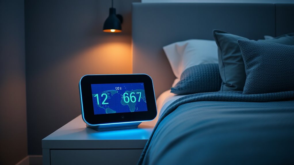 Think of a sleep-optimized CO2 monitor as your night’s best friend. Look for features like real-time readings, easy-to-read displays, and alerts for elevated CO2 levels. Sleep tracking capabilities and integration with smart home devices are bonus perks. These features guarantee you’re not just monitoring but actively improving your sleep environment. After all, a good night’s sleep begins with understanding and managing what’s in your air.