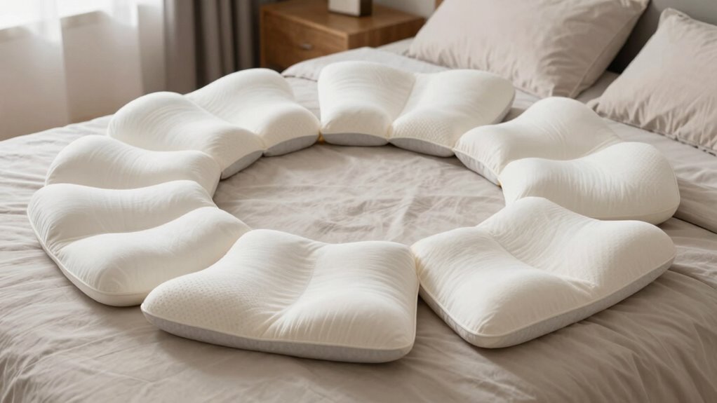 Choosing the right contour pillow depends largely on your sleep position, as each requires specific support to keep your spine aligned and prevent discomfort. If you sleep on your back, look for a pillow with moderate elevation that supports your neck without lifting your head too high. Side sleepers need higher, more pronounced contours to fill the gap between the neck and shoulder, preventing strain. Stomach sleepers should opt for a lower profile pillow to avoid excessive neck bending and maintain comfort. Additionally, adjustable contour pillows can be a versatile choice, accommodating multiple sleep positions and providing personalized support. Selecting a pillow that matches your primary sleep position helps guarantee proper alignment, reduces pain, and promotes restful sleep throughout the night.