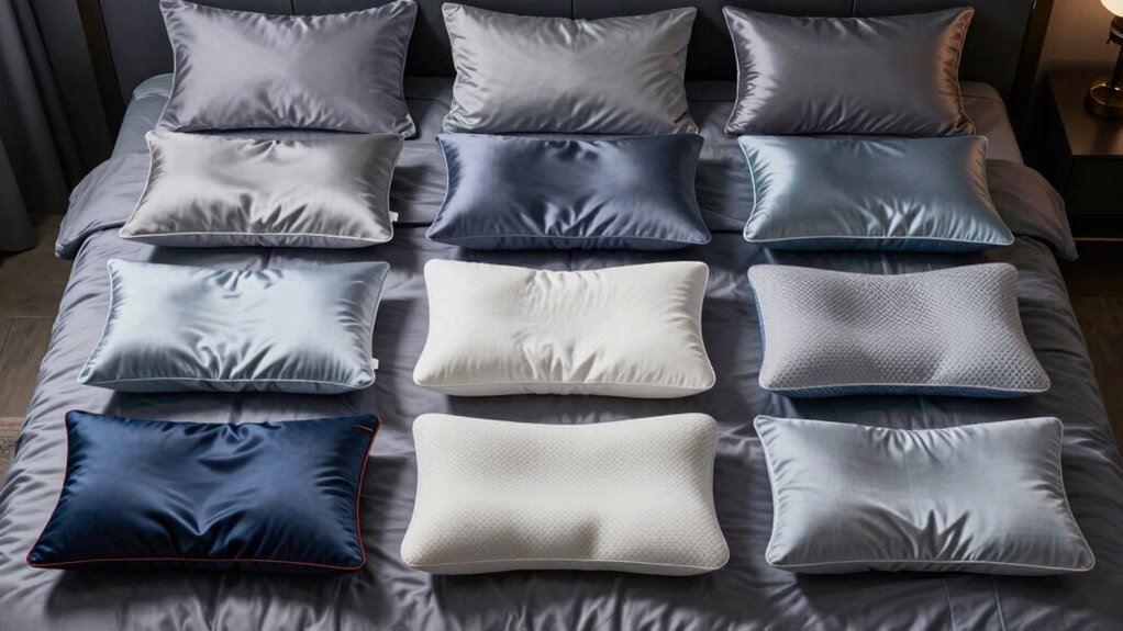 Choosing a cooling pillow that truly keeps you comfortable all night hinges on understanding how its materials and design promote temperature regulation. Materials like gel-infused memory foam or phase change substances actively absorb and dissipate heat, helping maintain a cooler surface. Breathable fabrics such as ice silk or moisture-wicking covers enhance airflow, reducing heat buildup. Multi-layer constructions with integrated cooling tech improve thermal response, keeping temperatures steady throughout the night. Features like airflow channels, mesh structures, or shredded filling boost ventilation, preventing heat retention. The most effective cooling pillows respond to your body heat and adjust their temperature accordingly, which is especially important for hot sleepers. Prioritizing these factors ensures you stay cool, comfortable, and sleep soundly through the night.