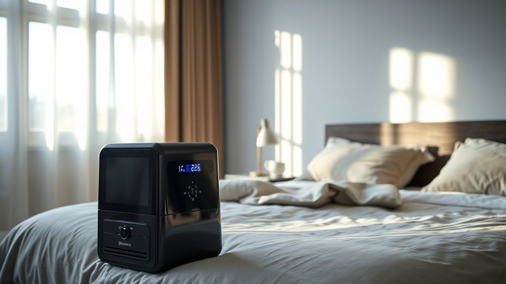 Since noise levels can substantially affect your sleep quality, it’s important to think about how loud a dehumidifier operates before making a purchase. Ideally, look for models that operate below 30 dB, ensuring quiet and undisturbed sleep. Noise levels between 36-40 dB are generally acceptable but might cause slight disturbance for sensitive sleepers. Ultra-quiet models with noise levels under 28 dB are perfect for light sleepers or nurseries, creating a peaceful environment. The motor and fan design greatly influence noise output; quieter devices often feature advanced insulation and vibration reduction techniques. Remember, lower decibel ratings mean a quieter operation, which is essential for maintaining a calm, restful bedroom atmosphere while effectively reducing humidity.