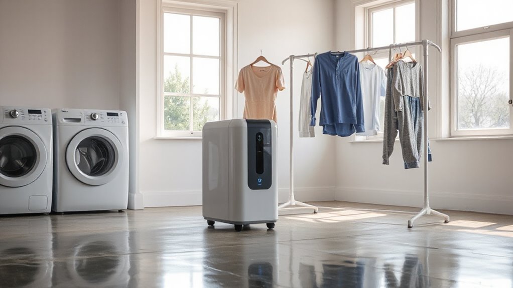 Dehumidifiers improve indoor air quality during laundry drying by reducing excess moisture, which prevents mold and musty odors. They also help minimize dust mites and airborne allergens that thrive in damp environments. I find that using a dehumidifier creates a fresher, healthier space, making laundry day less stressful. Plus, it helps your clothes dry faster and more efficiently, saving energy and preventing damage caused by excess humidity.