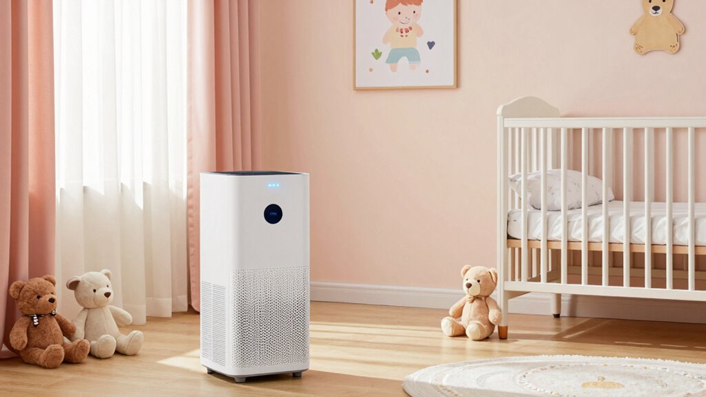 I recommend replacing the filters in your nursery air purifier every 6 to 12 months, depending on usage and the manufacturer’s guidelines. If you notice reduced airflow or lingering odors, it’s a good sign it’s time for a change. For maximum air quality, I suggest checking the filter indicator if your unit has one, and keeping up with regular replacements to guarantee a healthy environment for your little one.