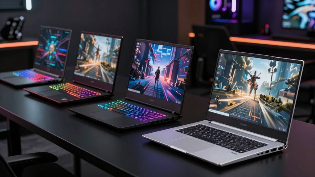 When choosing a gaming laptop under $1000, I focus on the GPU’s ability to handle modern games smoothly. I also consider the processor’s power to guarantee multitasking and future-proofing, along with display quality for a better gaming experience. Finally, I look at RAM, storage, and ports to make sure the laptop meets my gaming and connectivity needs efficiently.