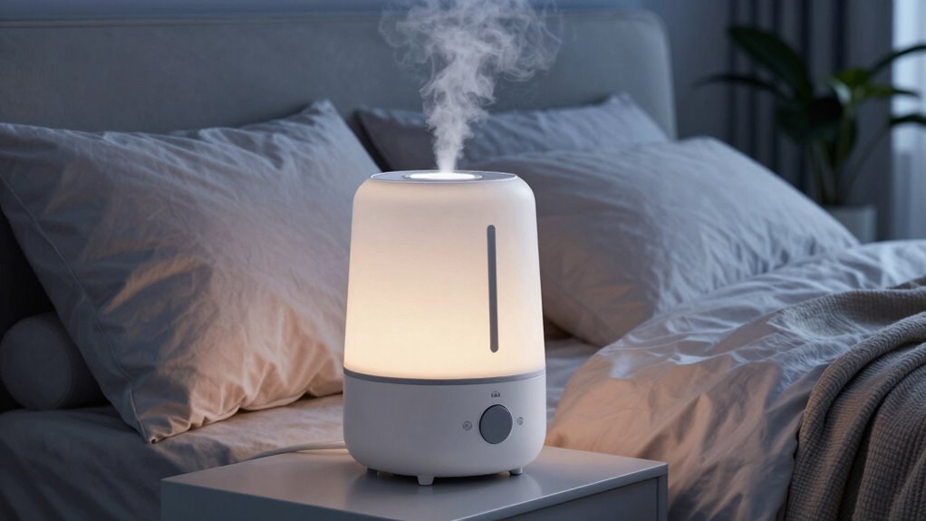 To enhance your comfort and create a more relaxing environment, consider humidifiers that offer features like built-in nightlights, adjustable mist settings, and aromatherapy compatibility. Built-in nightlights provide a calming glow that promotes relaxation and better sleep. Adjustable mist settings and directional nozzles let you customize humidity levels and distribution for maximum comfort. Aromatherapy compatibility allows you to add essential oils, improving air quality and adding soothing scents that can further ease dry sinuses. Quiet operation, measuring around 23-26dB, ensures the humidifier won’t disturb your sleep or relaxation routines. Additional features like auto shut-off and low-water indicators also boost safety and convenience during extended use. These comfort features can profoundly enhance your experience and make your bedroom a more soothing sanctuary.