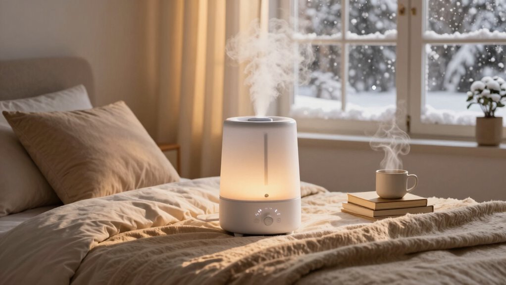 Choosing the right humidifier can truly transform your winter nights, making your bedroom cozy and comfortable—like a warm fire in a snowy village. As I’ve learned, considering size, features, and ease of use is key. Remember, a good humidifier isn’t just a gadget; it’s your trusty companion through the cold months. So, don’t wait for a Dickensian winter to realize you need one—prepare now and enjoy the comfort it brings.