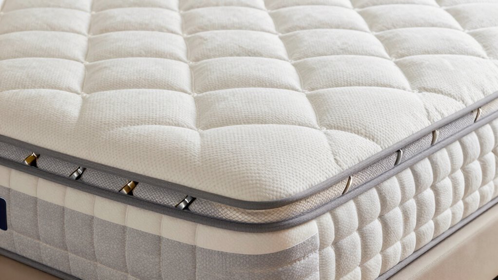To effectively alleviate hip pain, it’s crucial to prioritize pressure relief features in an innerspring mattress. Look for models with targeted zoned support, especially around the hips, to reduce pressure points and prevent soreness. Pocketed coils are a great choice because they conform individually to your body, offering customized pressure relief. Make certain the mattress has a sufficient comfort layer, like memory foam or soft padding, to cushion your hips and enhance comfort. Reinforced edge support is also important, as it ensures even pressure distribution across the entire surface, preventing sagging and maintaining consistent support. Finally, choose a mattress design that promotes proper spinal alignment, helping to relieve hip pain caused by misalignment and ensuring a more restful sleep.