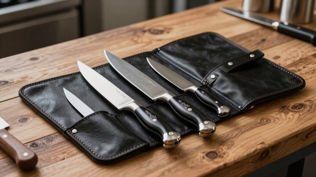 Choosing the right knife roll isn’t just about durability or style; it’s about balancing protection with accessibility. Whether you prefer the sleek elegance of leather or the rugged charm of canvas, each option offers unique benefits. Think of it as pairing a sharp blade with a sturdy sheath—both essential. Ultimately, your perfect knife roll combines practicality and personality, keeping your tools safe while reflecting your culinary journey.