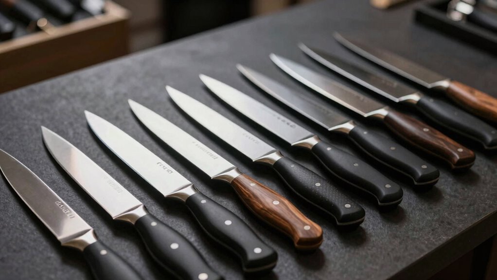 Blade material quality sets the foundation for a good knife, but how it feels in your hand makes all the difference during use. A well-balanced knife distributes weight evenly between the handle and blade, allowing for precise control and less fatigue during long chopping sessions. The ideal weight for a kitchen knife falls between 6 and 8 ounces, providing enough heft for effective cutting without sacrificing maneuverability. Heavier knives offer more power but can tire your hand faster, while lighter ones are more agile but may require extra effort for tough cuts. The balance point, often near the bolster or handle, influences comfort and cutting smoothness. Properly weighted and balanced knives help you cut more accurately, work safely, and cook more efficiently.