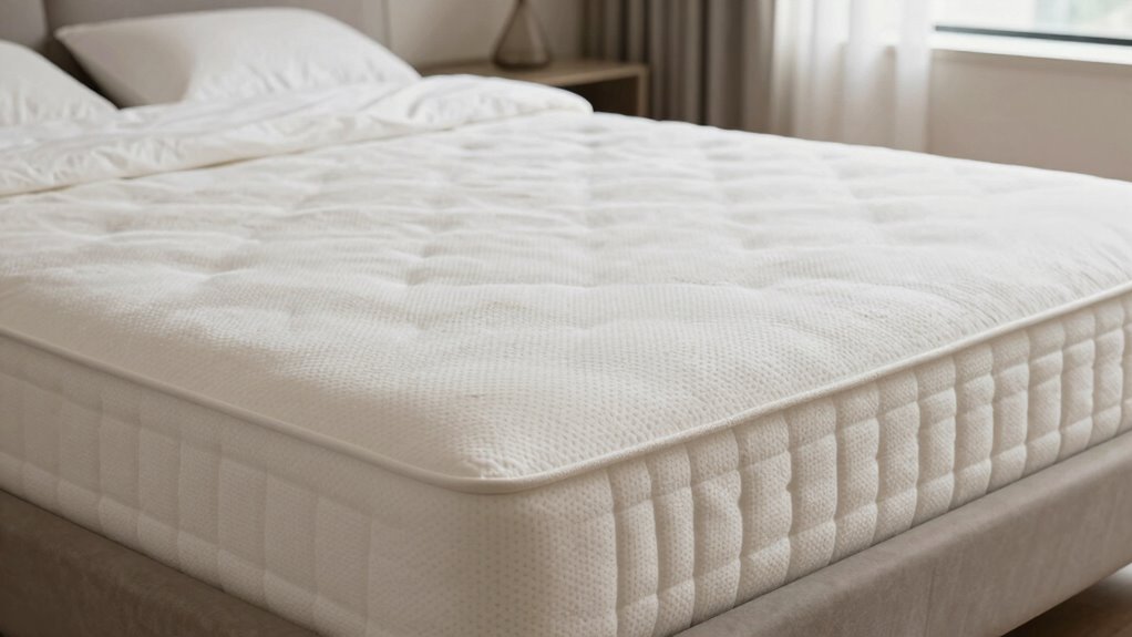 Choosing the right latex mattress topper to make your bed firmer starts with guaranteeing it fits your mattress perfectly. First, check that the topper’s size matches your mattress dimensions for a snug fit, which guarantees consistent firmness and prevents slipping. Next, confirm the firmness level aligns with your desired firmness—whether firm, medium, or extra-firm—to guarantee compatibility. It’s also important to contemplate the material—Talalay or Dunlop latex—and how it supports your existing mattress’s material and support system. Look for features like elastic anchor bands or secure-fit straps to keep the topper in place. Lastly, the thickness matters; a thicker layer, around 3 inches, generally offers a more noticeable firming effect compared to thinner toppers.