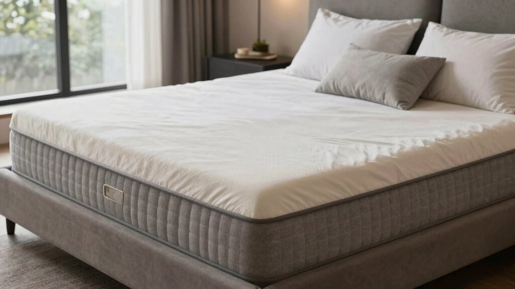 Maintaining a cool, comfortable sleep environment is essential for stomach sleepers, which is why temperature regulation technology in memory foam mattresses matters. Modern mattresses often incorporate gel-infused foams that dissipate heat twice as fast as traditional foam, helping you stay cooler all night. Graphene-enhanced memory foam improves airflow and thermal conductivity, maintaining a more consistent temperature. Ventilated designs and open-cell foam structures promote better air circulation, reducing heat buildup and night sweats. Additionally, cooling covers made from breathable, moisture-wicking fabrics boost overall temperature control. Some mattresses even combine dual cooling systems—gel memory foam with high thermal conductivity materials—to considerably cut down tossing and turning caused by overheating. Prioritizing these features can make a big difference in your sleep quality.