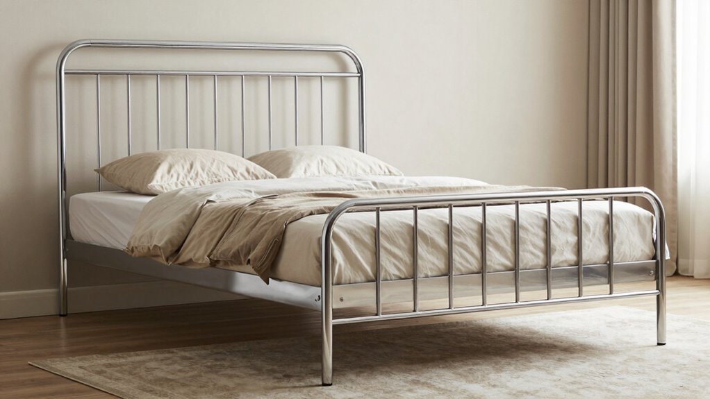 Just like the steady beat of a heart or the unwavering pulse of a lighthouse guiding sailors home, choosing the right queen metal bed frame sets the rhythm of your nights. With options that blend storage, style, and durability, you can find your perfect match. Remember, a sturdy frame isn’t just foundation—it’s the silent partner in your dreams, anchoring you through every sleep and awakening. Sweet dreams start with the right support.