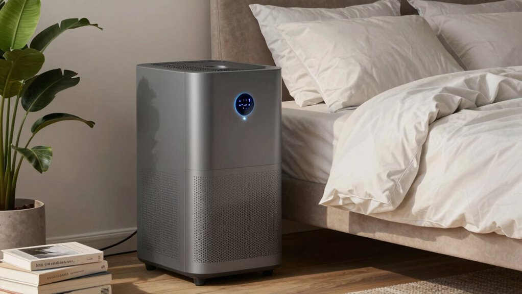 Operation silence levels play a significant role in selecting a bedroom dehumidifier because they directly impact comfort and sleep quality. I look for models that operate below 30 dBA, which is as quiet as a whisper or soft background noise. During sleep mode, noise levels should stay under 35 dB to prevent disturbances. Thermoelectric or Peltier-based dehumidifiers are often quieter than compressor types, making them ideal for bedrooms. Many units include sleep or quiet modes that reduce fan speed and turn off lights, lowering noise even further. When comparing options, I pay attention to the decibel ratings—aiming for devices that operate within the 20-30 dB range for minimal disruption. This ensures a peaceful environment, perfect for restful sleep.