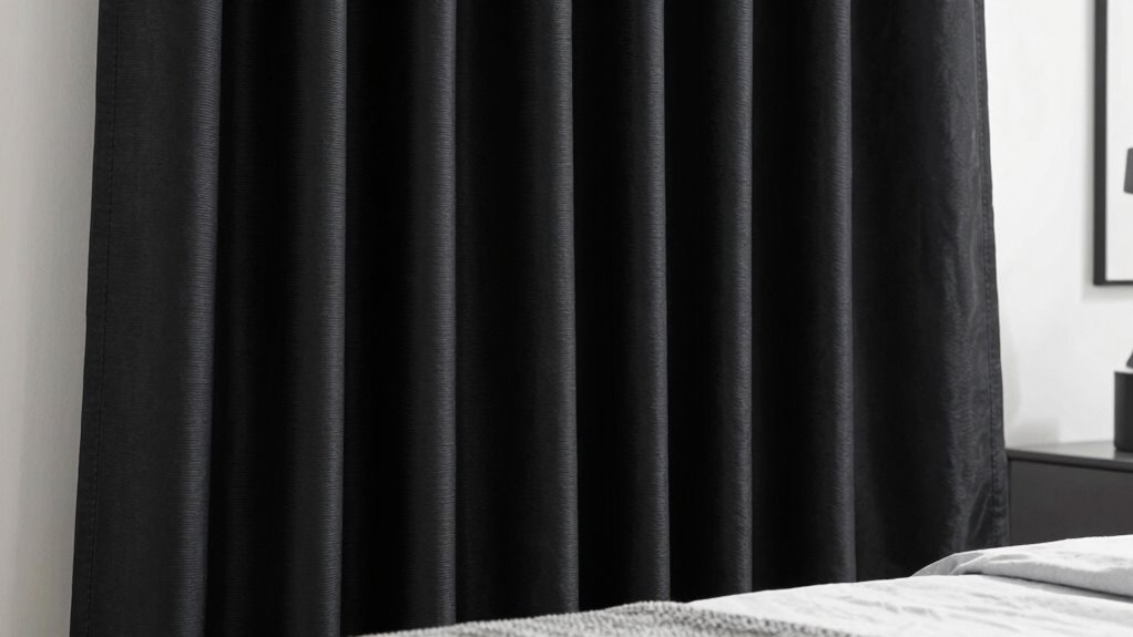 The light blocking efficiency of thermal blackout curtains depends on several key factors that directly influence how well they can darken a room. First, the percentage of light they block ranges from 85% to 99%, with higher percentages providing closer to complete darkness—ideal for sleep or media use. The fabric construction plays a vital role; features like triple weave technology and black liner backing enhance light blockage. Darker colors typically offer better efficiency because of denser fabric and pigmentation. Proper installation also matters—keeping curtains snug against the window frame minimizes gaps that let in light. By considering these factors, you can select curtains that truly darken your space and improve your comfort, whether for resting or creating a media room ambiance.